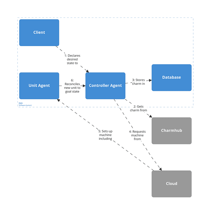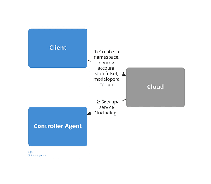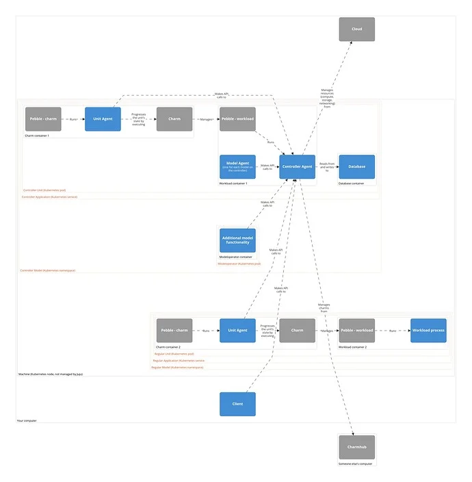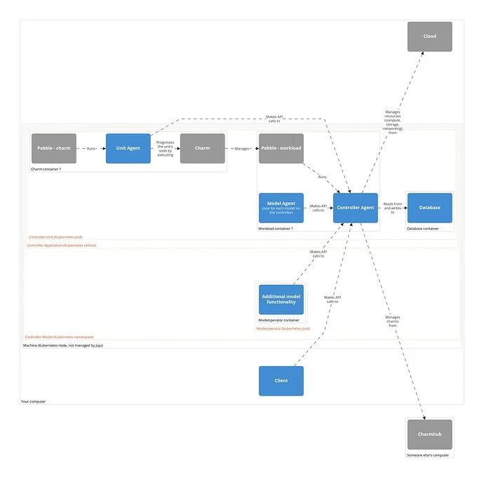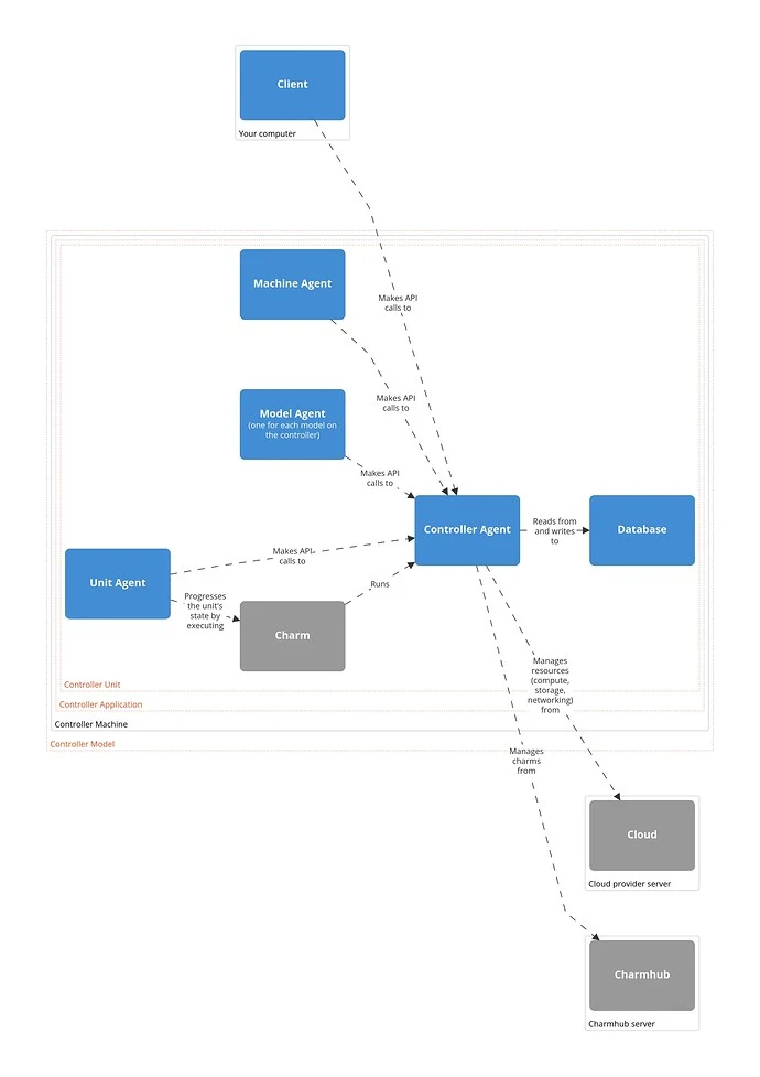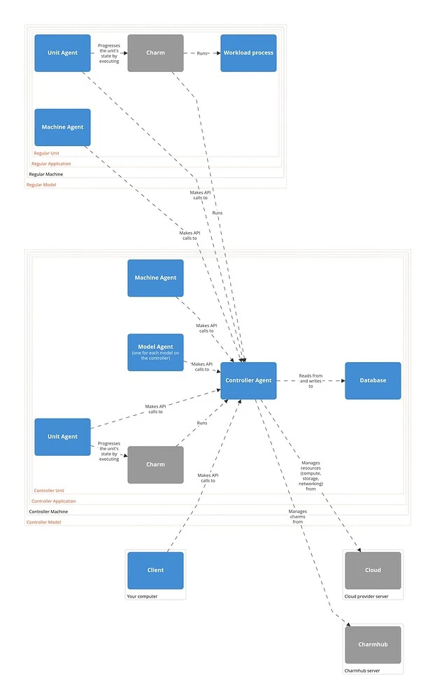 On most machine clouds, Juju makes it possible to deploy to a system container inside the machine rather to the machine directly. The result doesn’t change much: In terms of the diagram above, the only difference would be another box in between the “Regular Model Machine” and its contents and another machine agent for this box, as Juju treats system containers as regular machines.