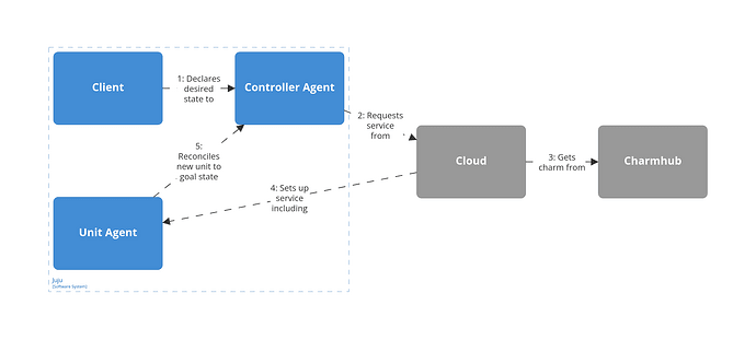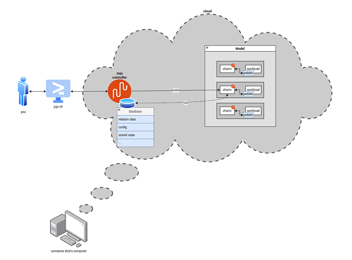 Suppose you have a workload; a database, a webserver, a microservice… And then you write a charm to manage your workload. Then you go on and deploy it in some model in some cloud on which you bootstrapped a juju controller.