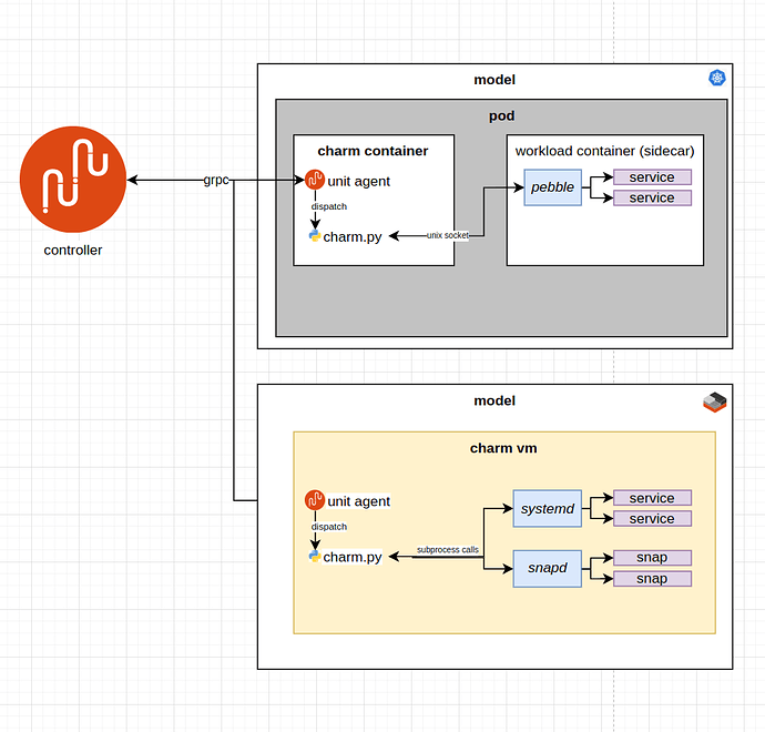 The Juju controller fires hooks at the unit agent that is in the charm container / machine. The unit agent executes the charm according to certain charm environment variables. For a charm written with Ops (the current standard), Ops translates these environment variables into events, and these events are observed and handled in the charm code. All of this is represented schematically in the diagram below, where the top depicts the situation for a Kubernetes charm and the bottom – for a machine charm.
