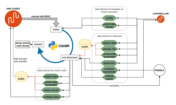 A final note on synchronization: the charm (or rather the unit agent on its behalf) and the controller exchange information. For example the charm could get the relation data contents, or set the unit status. When is this data exchanged, at which point in the charm’s runtime?