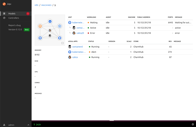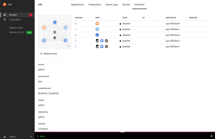 The machine view displays all machines managed by Juju. It all also displays the machine status and any applications running on the machines.