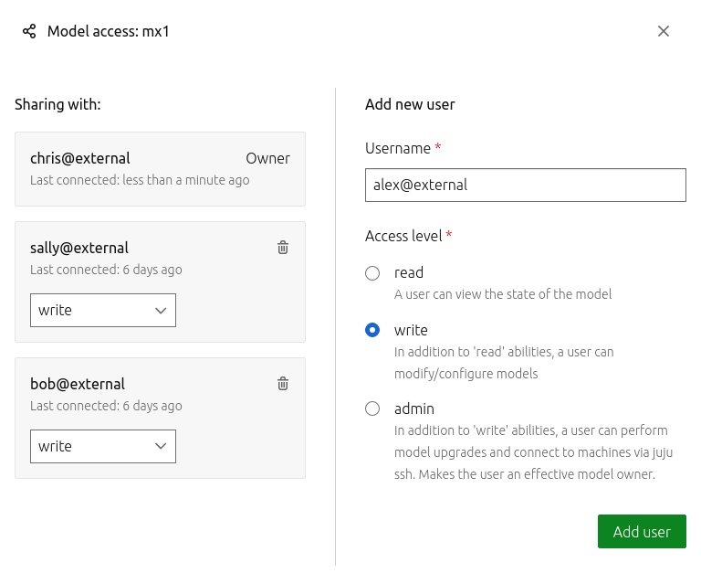 To add a user, enter the username of the person you want to grant access too. Then select the permission level you would like to grant. Finally, click the “Add user” button.