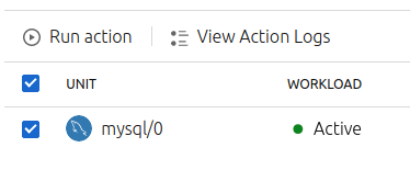 Actions are run on the unit level. To view and trigger actions, visit an application’s unit view, select the units you would like the action to run on, and click the Run actions button. This will bring up a side panel with a list of available actions. Find and select the action you wish to run, provide any necessary options, and click “Run action”.