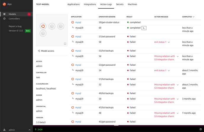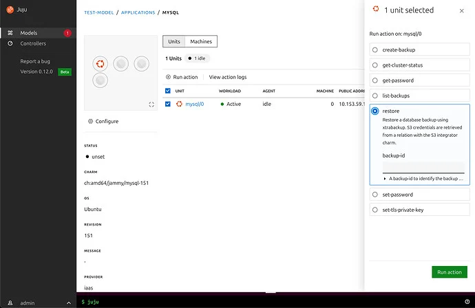 If you have write or admin permissions on a model, you can trigger any available action the charmed application provides. If the action requires options, the UI will provide these as a form with help text to describe the options and the default values.