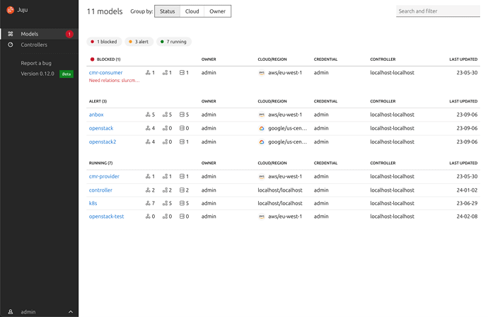 The models view lists all the models associated with the connected controllers that you have some form of access to. The list displays the models across clouds. This allows you to access the health of all the models at a glance, surfacing any relevant errors so you can quickly investigate what has happened.